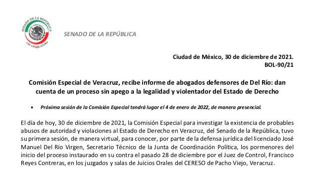 Durante su primera sesión los miembros de la Comisión que investigan los probables abusos de autoridad y violaciones al estado de derecho en Veracruz, los senadores que la integran fueron informados por la defensa de José Manuel del Río, secretario técnico de la Junta de Coordinación Política del Senado, de los detalles del inicio del proceso que se lleva en su contra.