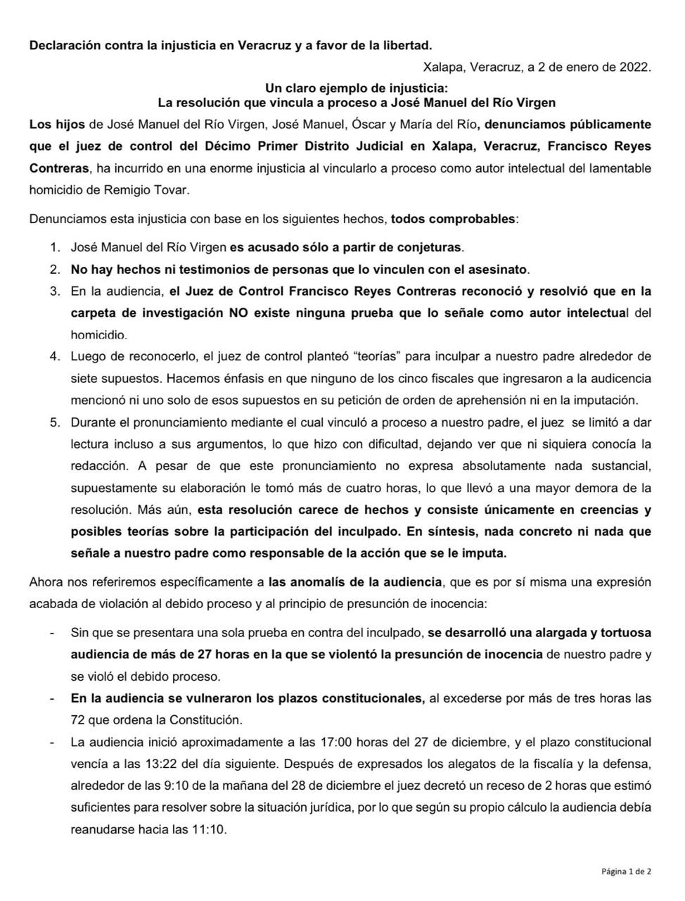 En una carta enviada a los medios de comunicación, José Manuel, Óscar y María del Río calificaron de injusta la resolución que vincula a su padre José Manuel del Río Virgen en el supuesto homicidio en contra de Remigio Tovar.