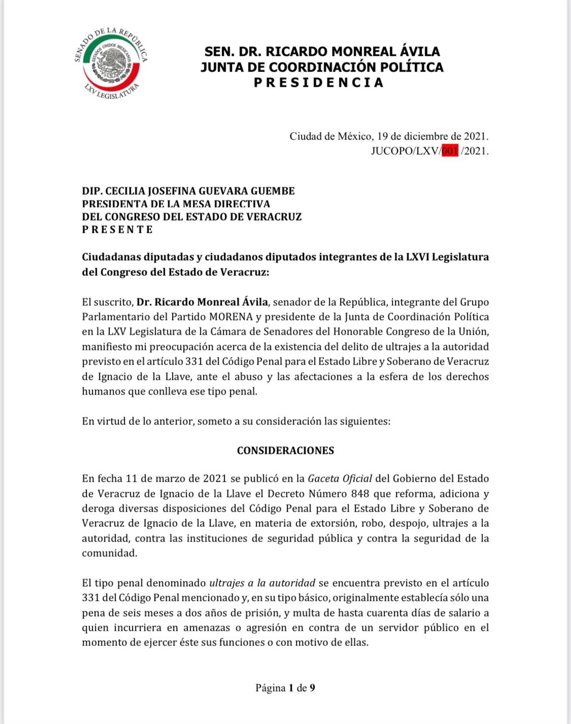 Tal como lo prometió y en su calidad de presidente de la Junta de Coordinación Política del Senado, Ricardo Monreal envió un exhorto respetuoso a la presidenta de la Mesa Directiva del Congreso del estado de Veracruz, Cecilia Josefina Guevara Guembe, para que lleve a cabo las acciones legislativas que correspondan para derogar el tipo penal de ultrajes a la autoridad.